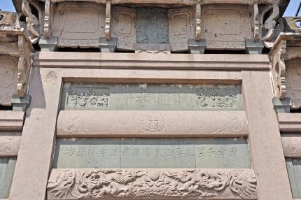 牌坊整体屋顶的纤细空透与坊身的粗壮稳 重形成虚实、轻重的对比,并给人以美感。牌 坊前立坐姿石狮一对,高 2.3 米,造型别致。 1983 年列为县级文物保护单位。