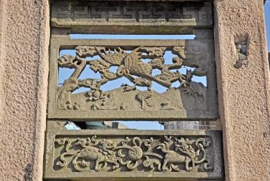 丁氏钦旌节孝坊位于乐清市南塘杨州村交 通中路 49 号,建于清光绪三十二年 (1907)。 牌坊为青石仿木结构,现存四柱三间,定盘枋 下基本完整。面阔 6.35 米,高 4.5 米。明间设 定盘枋、中枋、花枋、下枋。花枋正面阳刻 “钦旌节孝”四字,左右两边设花板,刻蝙蝠纹 饰。花枋背面刻圣旨全文和请旨建坊的官员名 字,依稀可辨为“頭品顶戴兵部尚书兼都察院 右都御史镇守福州将军兼署闽浙总督部堂世袭 奉恩将军崇善、頭品顶戴兵部侍郎兼都察右都 御史巡抚浙江部院节制水陆各镇兼管两浙盐政 聂为、頭品顶戴浙江等处承宣布政司布政使兼管海防事务加五级记录十次囗囗、钦命三品头 顶戴兼理浙江……”等。花枋与下枋间有两个 桃形构件装饰,下枋正面刻寿星等人物故事图 案,背面刻“国学生陈式淦元配丁氏孺人之 坊”。次间设定盘枋、花枋、下枋,左右两边下 枋上浮雕双狮戏球图案,雕工精致。下枋上设 花枋,花枋左右两边镂雕松鹤和松鹿图案,图 案规整,雕刻细腻。丁氏钦旌节孝坊雕刻精美,保存基本完整。 它对于了解清代乐清民风民俗和宗族制度、建 筑特征等提供了珍贵的实例。2010 年列为乐清 市文物保护单位。